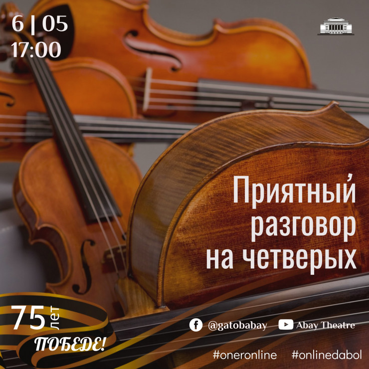 Казахский государственный академический театр оперы и балета имени Абая в рамках онлайн-проекта Gatob_Life сегодня, 6 мая, в 17.00 приглашает зрителей на вечер классической музыки в исполнении струнного квартета. Концерт "Приятный разговор на четверых" пройдет в онлайн-режиме в официальном аккаунте в YouTube "Abay Theatre", рассказывает TengriNews.kz.