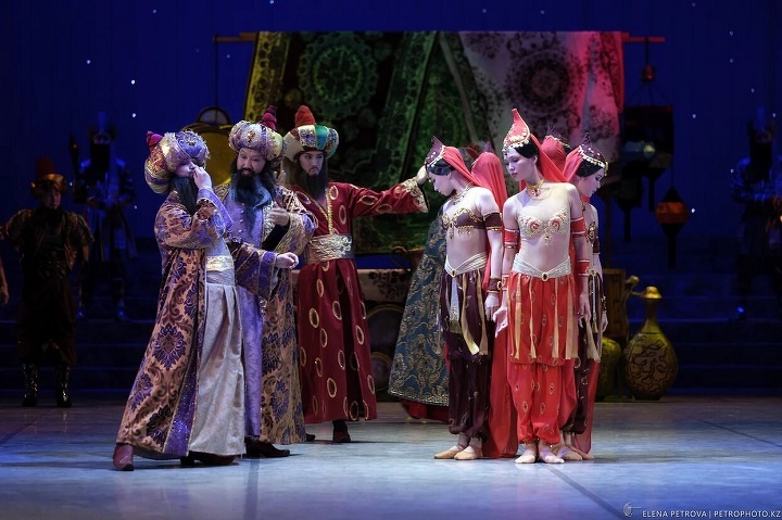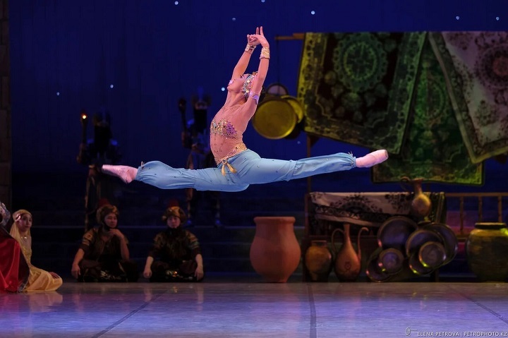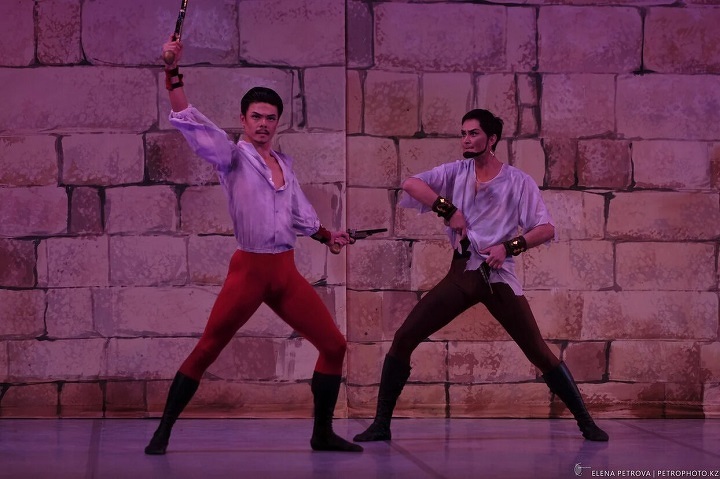 Старого «морского разбойника», конечно, постарались осовременить. Открывается занавес — и перед публикой не привычный «задник», а экран, на котором бушует анимационное море и тонет корабль с корсарами (видеографика Ергена Токмурзина). Впечатляющие декорации спектакля сделаны по рисункам итальянского сценографа Вильяма Орланди и воплощены на сцене Есенгельды Туяковым, который в программке скромно назван «ассистентом художника- постановщика». Хотя, как объяснила Ая Калиева, именно на его плечи легла вся работа и ответственность — после отправки эскизов итальянец попал в больницу и перестал выходить на связь. На фоне воздвигнутых на сцене «каменных стен» отлично смотрятся костюмы Вячеслава Окунева, народного художника России. Ярчайшие цвета, много золота, настоящие павлиньи перья — восточный базар, каким он и должен быть, по крайней мере в балете. Если добавить, что среди солистов — кубинец Нельсон Пенья и японка Ариса Хасимото, то можно сказать, что спектакль получился интернациональным, и это пошло ему только на пользу.