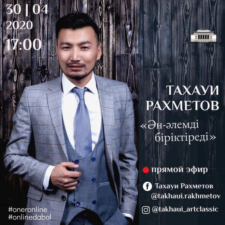 30 апреля в 17.00 солист оперы Тахауи Рахметов (тенор) выйдет в прямой эфир с программой "Ән-әлемді біріктіреді" на страницах в Facebook - Тахауи Рахметов @takhaui.rakhmetov и Instagram - @takhaui_artclassic. Многогранный репертуар оперных спектаклей лежит в основе выступления в формате Home Online Concert - в эфире прозвучат казахские народные песни, неаполитанские песни, арии из оперы Ахмета Жубанова и Латифа Хамиди "Абай". Также в программе прозвучит репертуар в честь 95-летия великого композитора, "короля вальсов" Шамши Калдаякова.