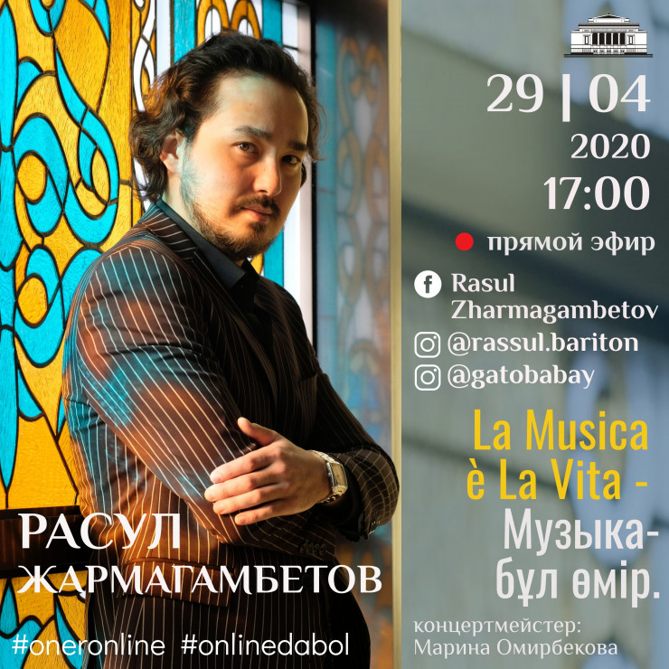 Сегодня, 29 апреля, в 17.00 с концертной программой "La Musica è La Vita - Музыка-бұл өмір" выступит солист оперной труппы Расул Жармагамбетов (баритон) в личных аккаунтах в Facebook - Rasul Zharmagambetov и Instagram - @rassul.bariton, с отсылкой на официальную страницу театра. Для артистов новый онлайн-формат выступлений непривычен: солисты оперной труппы выступают на сцене и видят своего слушателя, видят его эмоции.